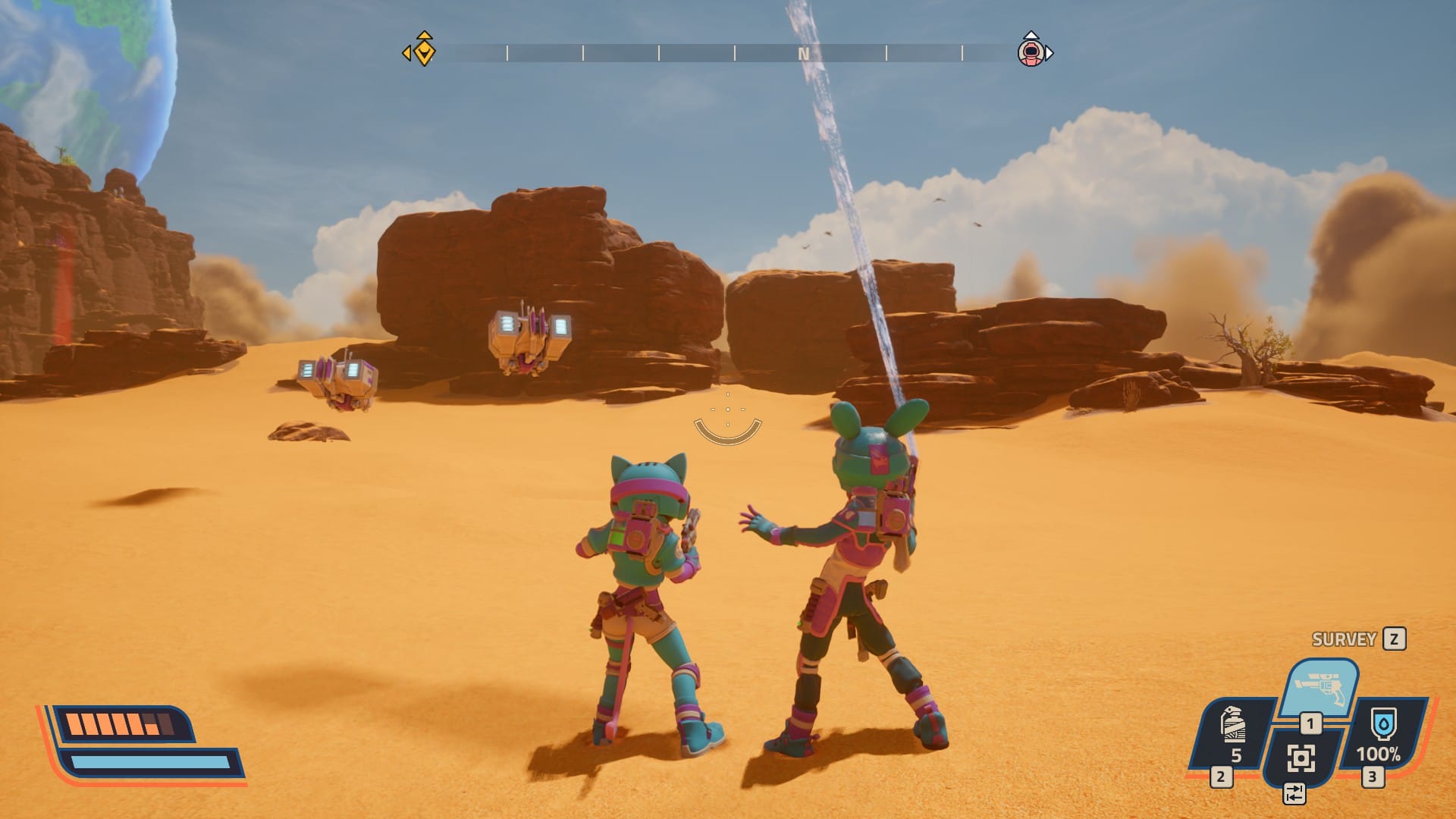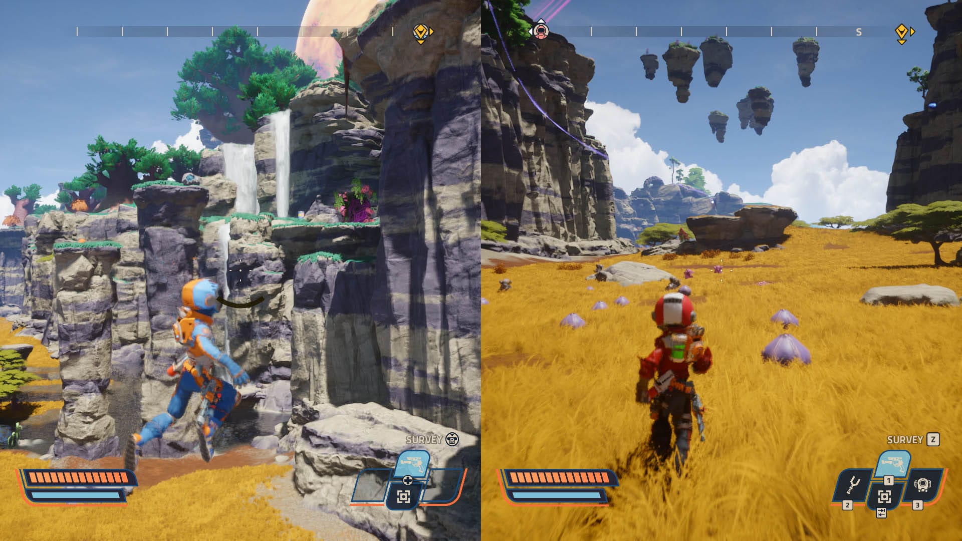 The biggest shake‑up is perspective: the original was first‑person; the sequel switches to third‑person. That one decision does a ton of work. Platforming reads clearer, situational awareness improves in the scrum, and the game can flex a wilder animation style—your explorer squashes and stretches like a cartoon character that survived a Looney Tunes stunt. It’s not just cosmetic; reviewers widely flagged how the shift, paired with multiple planets, makes the world design feel more cohesive and consistently rewarding to poke around.