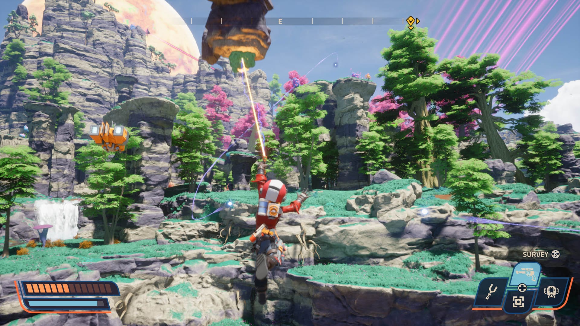 The structure echoes modern Metroidvanias in spirit—return to earlier areas once you’ve unlocked the movement or tool gate that used to taunt you—across four primary worlds (plus a cheeky “maybe more” tease). Each biome is dense with scannables, secrets, and side detours; rarely do you jog ten meters without seeing an enticing ledge or an odd plant daring you to poke it.