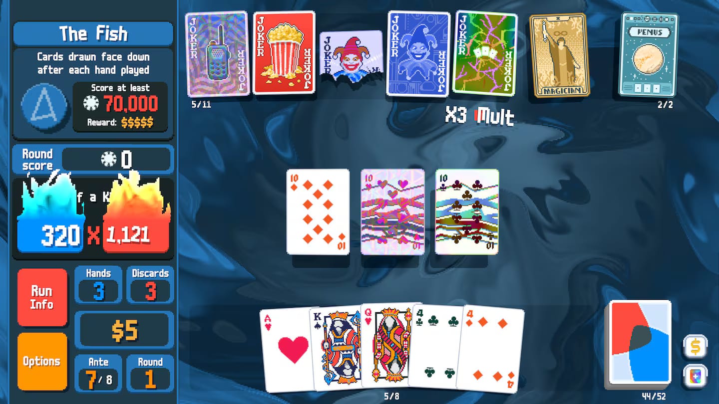 Proof that one brilliant idea can conquer the world, Balatro fuses poker hands with roguelike escalation to create a perfect, endlessly replayable “one more run” machine. You’re not gambling—there’s no real money here—but you are building engines: jokers with wild synergies, planet cards that level up hands, tags that reshape a run’s economy. It’s simple to explain, blissful to optimize, and fiendishly hard to master. The game’s meteoric rise (and award wins) reflect how universally it clicks, whether on a handheld during a commute or on a triple‑monitor PC. If 2024 had a single “everyone’s playing it” indie, this was it, and it’s destined to be a permanent install for years. When people say “tight design,” they mean Balatro.